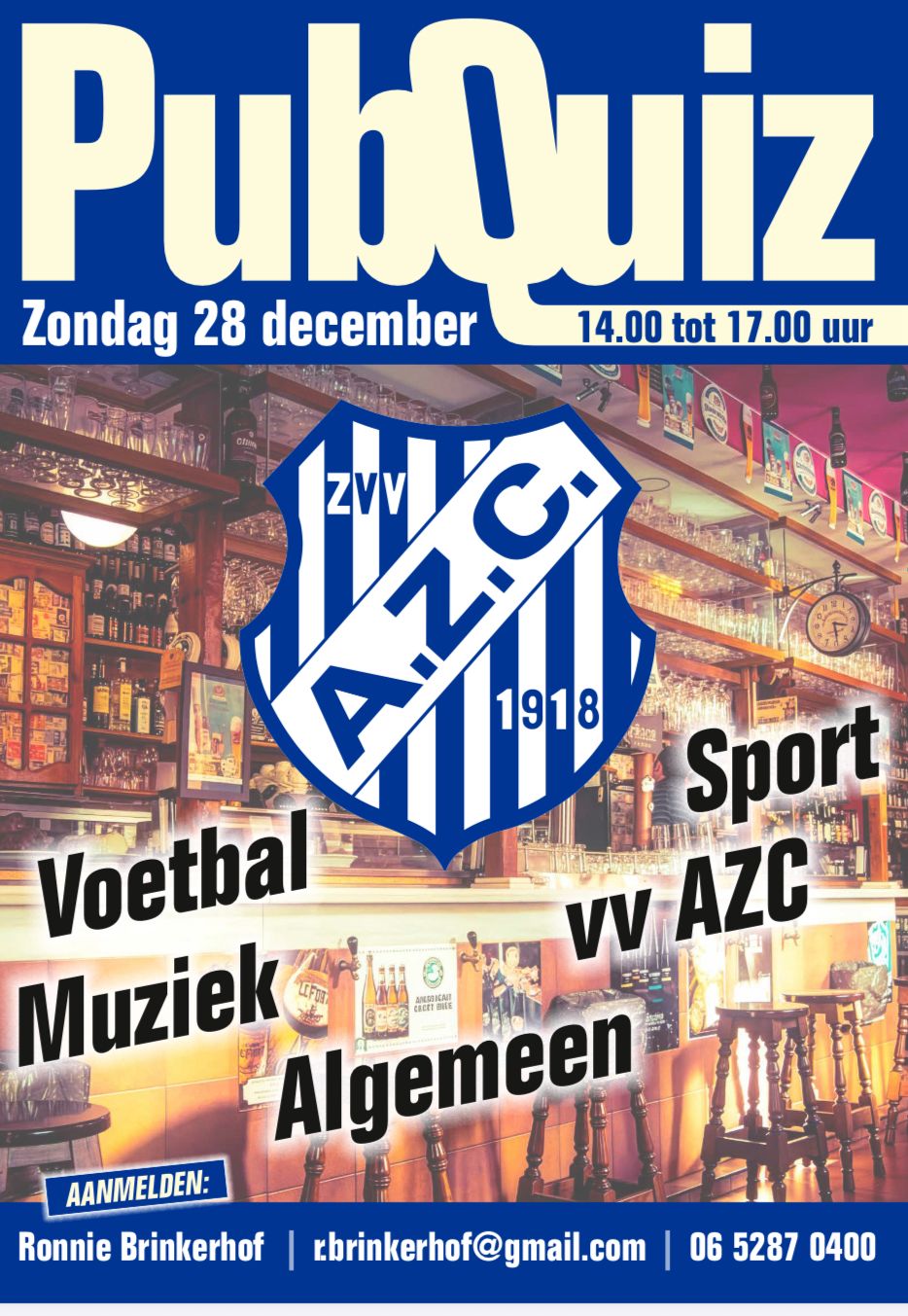 Ben jij klaar voor een middag vol spanning, plezier en kennis? Doe dan op zondagmiddag 28 december met de AZC-pubquiz; een geweldige quiz voor iedereen die houdt van een goede uitdaging!