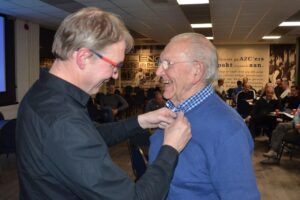 Henk Lentelink krijgt het speldje voor 70 jaar lidmaatschap opgespeld door voorzitter Patrick Govaers.