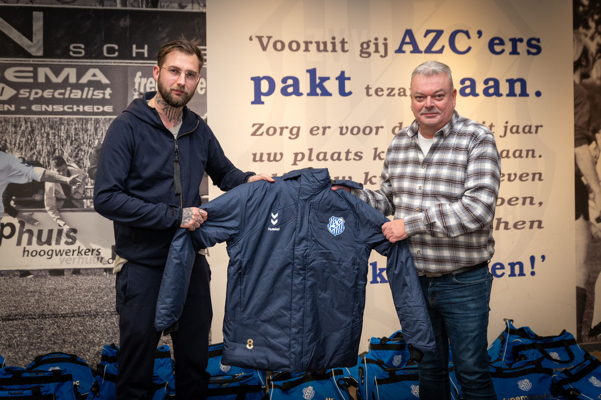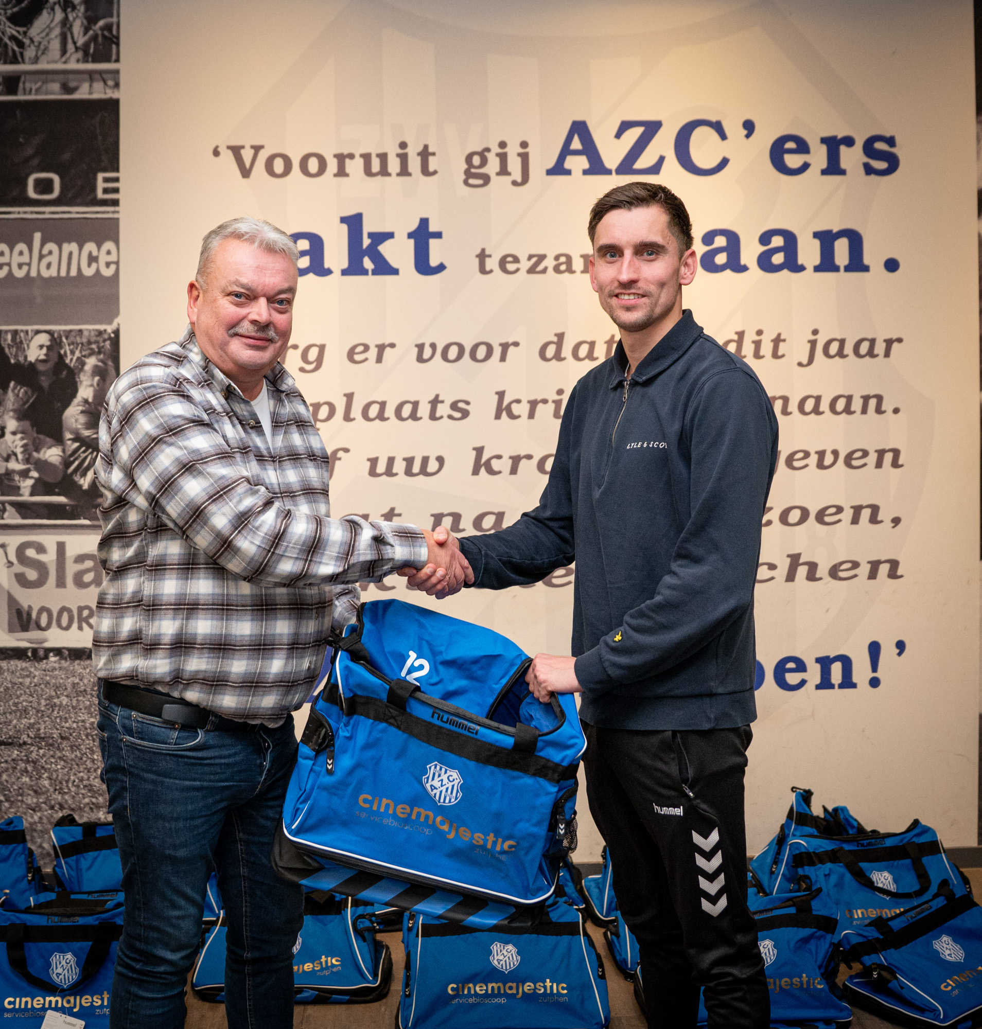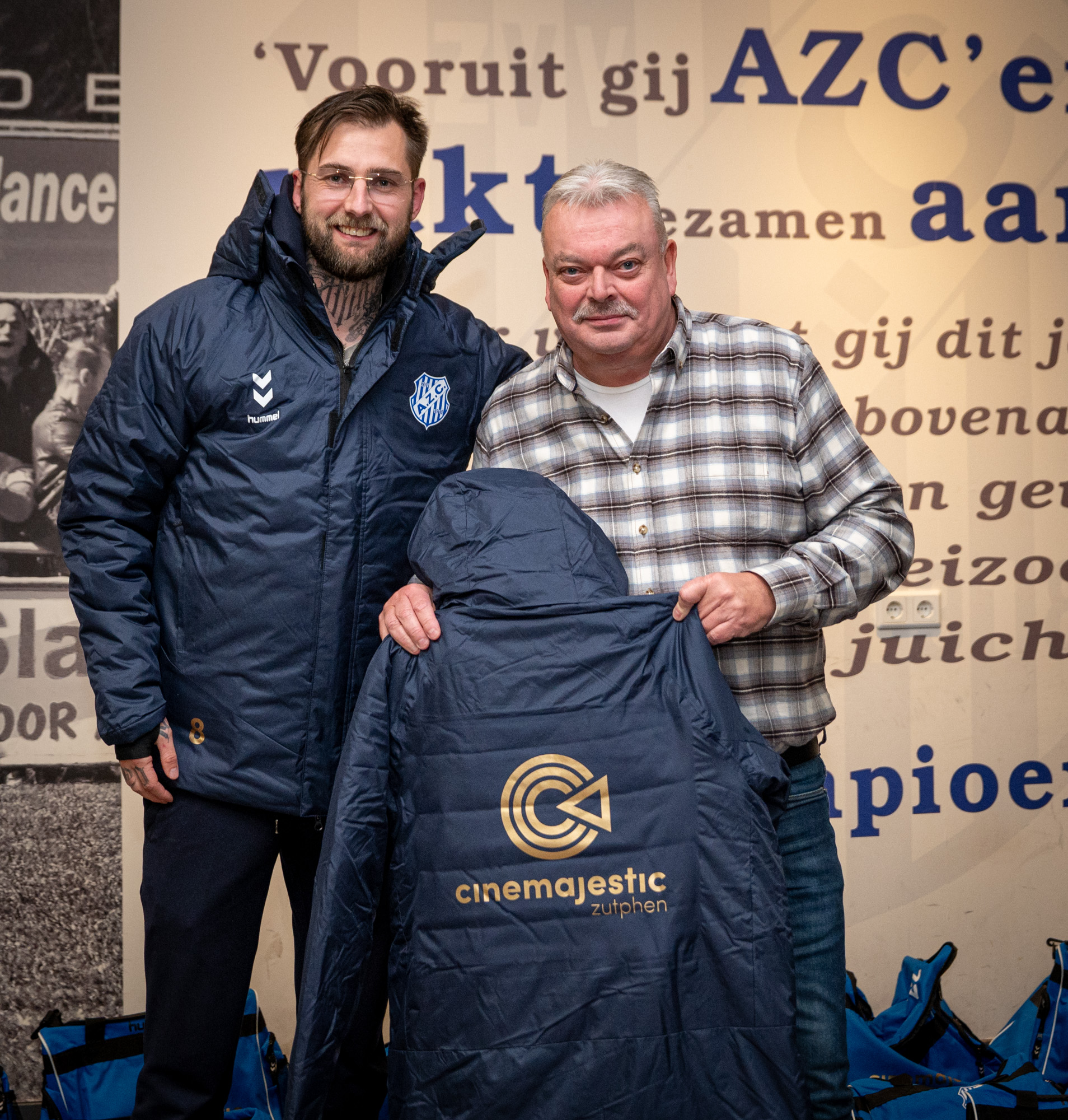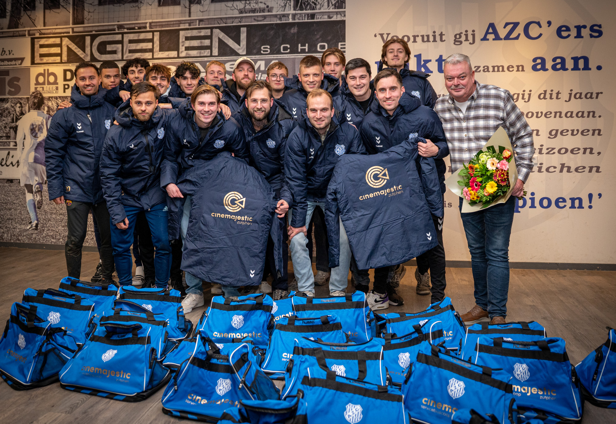 Het eerste elftal van AZC loopt er weer piekfijn bij. Afgelopen week overhandigde Ron Gerrits van hoofdsponsor Cinemajestic de nieuwe jassen en tassen voor onze hoofdmacht. Dit leidde tot deze vrolijke plaatjes.