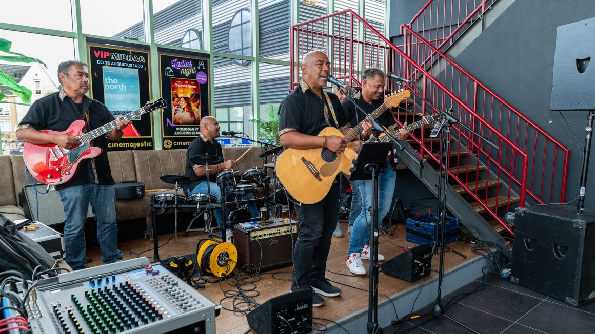 Na het bezoek stapte iedereen op de fiets richting het terras van Cinemajestic, waar de dames inmiddels ook waren gearriveerd. SCA-bestuurslid Mirjam van der Kwast deelde de consumptiemunten uit, voorzitter Johan Veerwater sprak een kort welkomstwoord. En daarna was het voor iedereen vooral gezellig bijkletsen. Binnen zorgden de Pindaklappers – met opnieuw een hoofdrol voor zanger/gitarist Jan Itjang – voor een lekker stukje muziek.