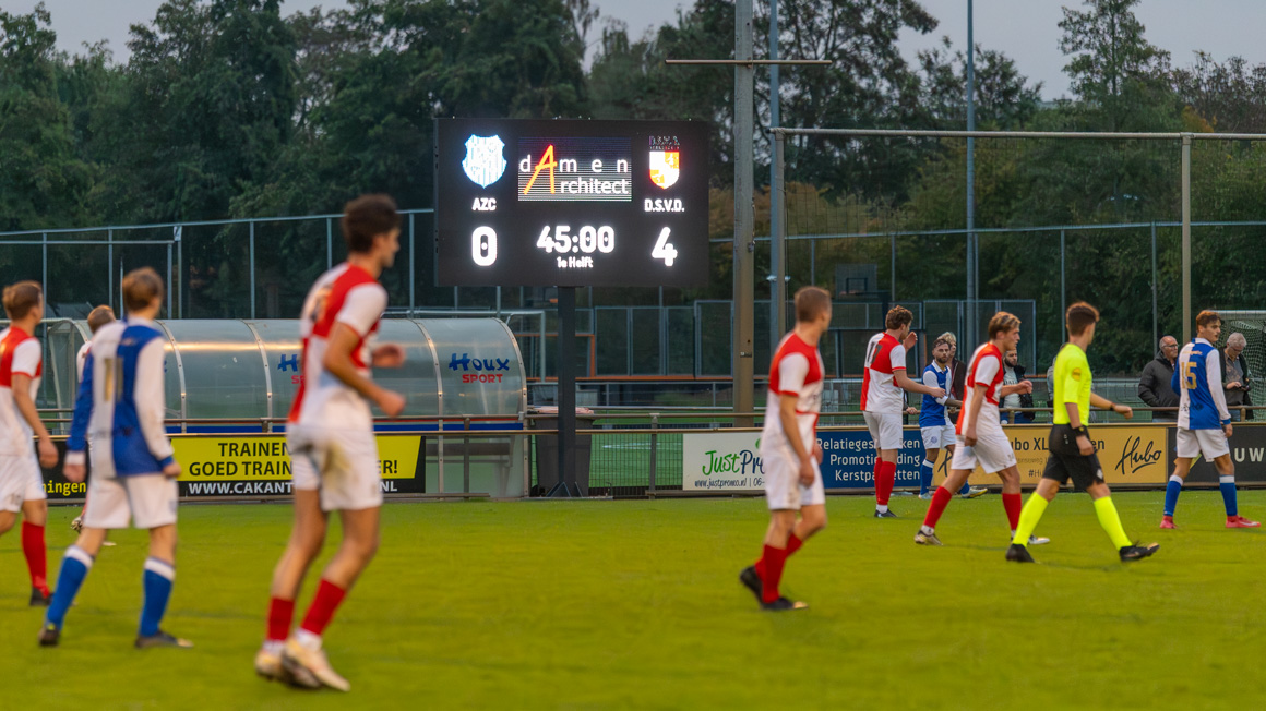 Na de goede openingsfase kroop DSVD ook wat meer uit haar schulp. Nadat de ploeg eerst een waarschuwing had afgegeven door een kans na een snel genomen vrije trap naast te schieten was het na twintig minuten wel raak. Een goede crossbal werd door de topschutter van de koploper op juiste waarde geschat en hij liet vervolgens doelman Nardo van den Broek kansloos met een droge schuiver: 0-1. AZC probeerde via Mika wat terug te doen, maar de aanvaller zag zijn inzet voorlangs gaan. Na 26 minuten weten de gasten de score te verdubbelen. De bal werd vanaf de rechterkant voorgegeven, waarna een DSVD’er goed weet weg te draaien bij zijn bewaker en het leder vervolgens vanuit een moeilijke hoek hoog in het dak van het doel weet te jagen: 0-2. AZC is van slag door deze tegenslag en weet in de eerste helft niets meer te creëren. Maar het leed voor AZC wordt nog veel groter als vlak voor rust een houdbare bal tot doelpunt wordt gepromoveerd en balverlies op het middenveld in de slotminuut genadeloos wordt afgestraft. Zo kijkt bij rust al tegen een onoverbrugbare 0-4 achterstand aan en kreeg AZC dus een lesje in effectiviteit van de koploper.