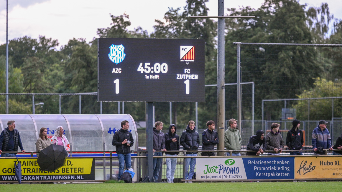 De bekerwedstrijd tussen AZC en FC Zutphen haalde het einde niet. Op het goedgevulde Hanzepark werd de stadsderby na 48 minuten spelen gestaakt door de slechte weersomstandigheden. Op dat moment prijkte er een 1-1 tussenstand op het scorebord. Het is nog niet bekend wanneer de wedstrijd wordt uitgespeeld.